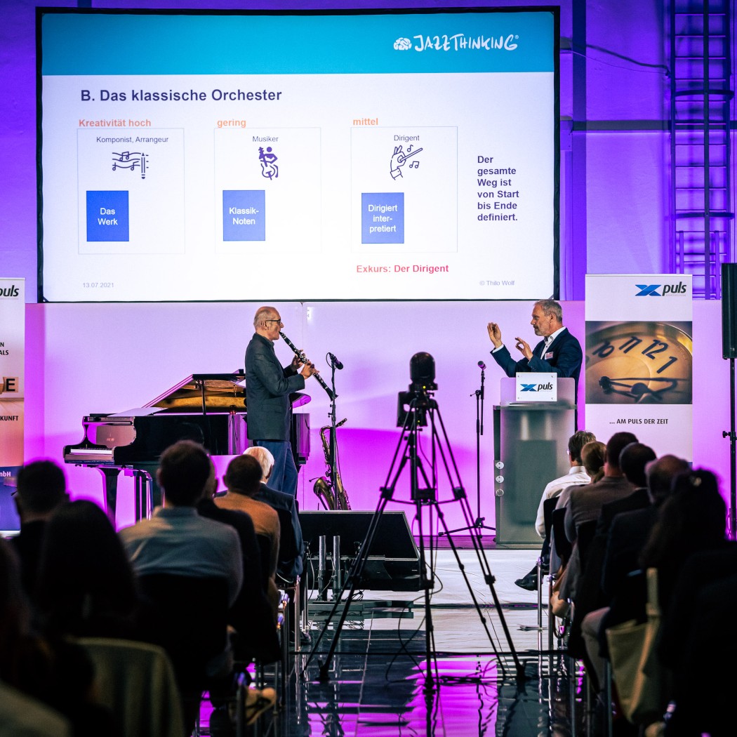 Das neue Format "JAZZTHINKING IN CONCERT". Hier kommt nicht nur der Referent Thilo Wolf auf die Bühne, sondern er bringt ein ganzes Musikensemble mit. Das kann ein kleines Jazz-Trio sein, aber auch eine Big Band oder ein großes Streich-Orchester mit ca. 20 Personen. Ein besonderes Erlebnis ist es auch, wenn Thilo Wolf seinen langjährigen Wegbegleiter Klarinettist Norbert Nagel zum Vortrag mitbringt und mit ihm eine weitere Brücke schlägt zwischen der Klassik, dem Jazz und den Unternehmen.